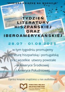 W dniach 28. 07 – 01.08.2025 zapraszamy Państwa do Filii Nr 1 przy ulicy Towarowej 20 na Tydzień literatury hiszpańskiej i iberoamerykańskiej. W tych dniach promować będziemy literaturę hiszpańską i portugalską oraz wszelkie utwory powstałe w Ameryce Środkowej i Południowej. Zachęcamy również do wypożyczania audiobooków.