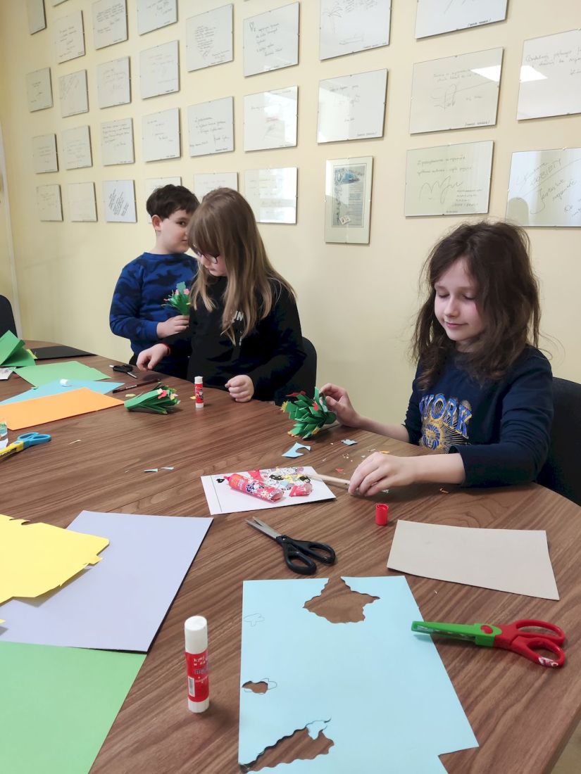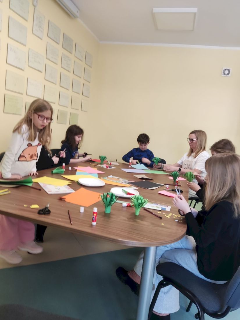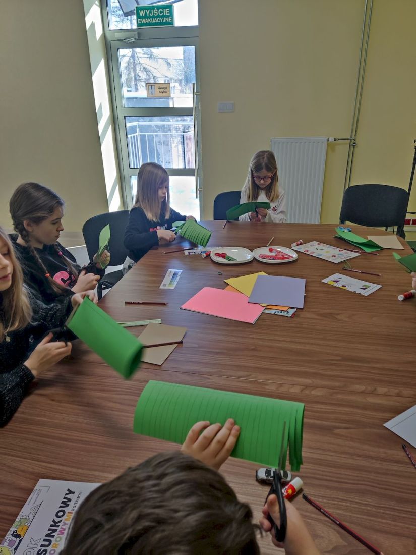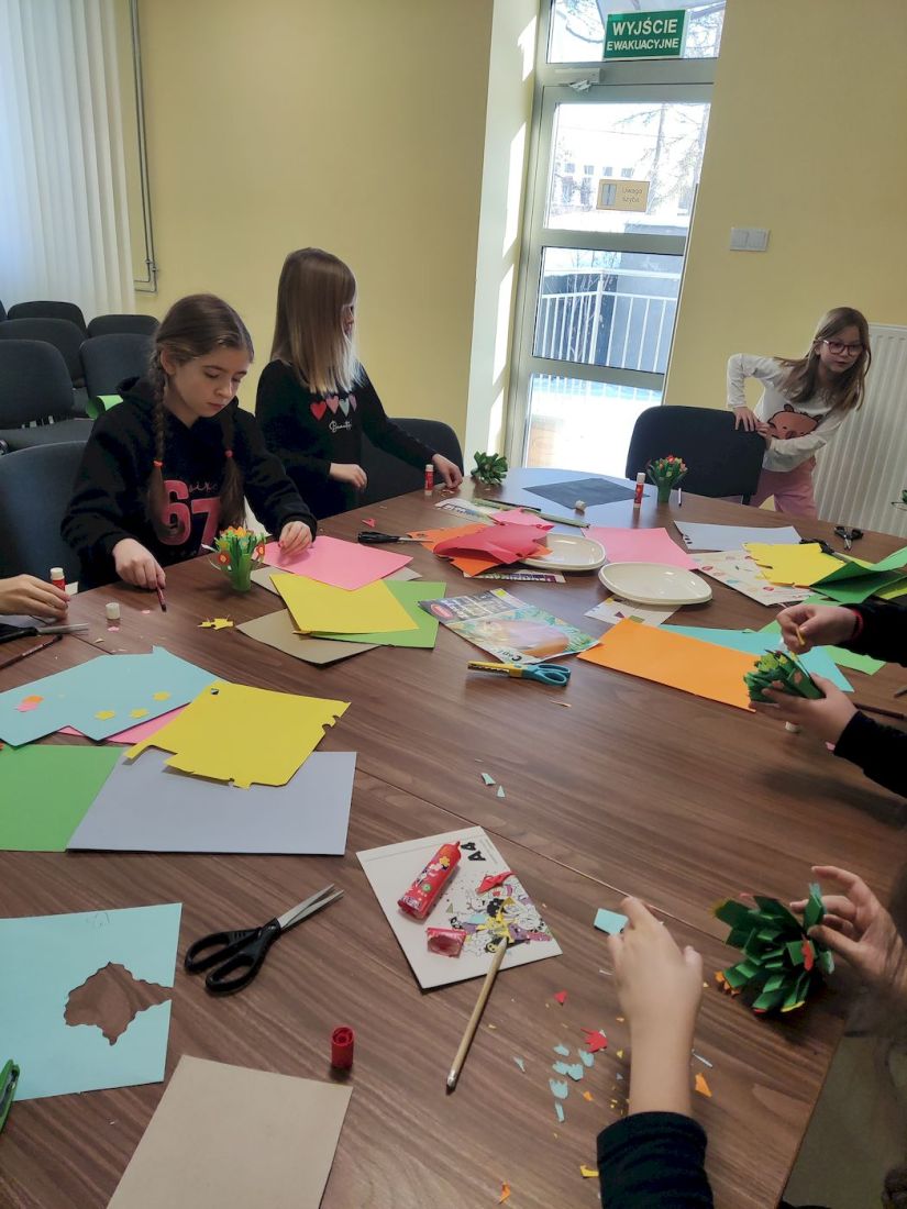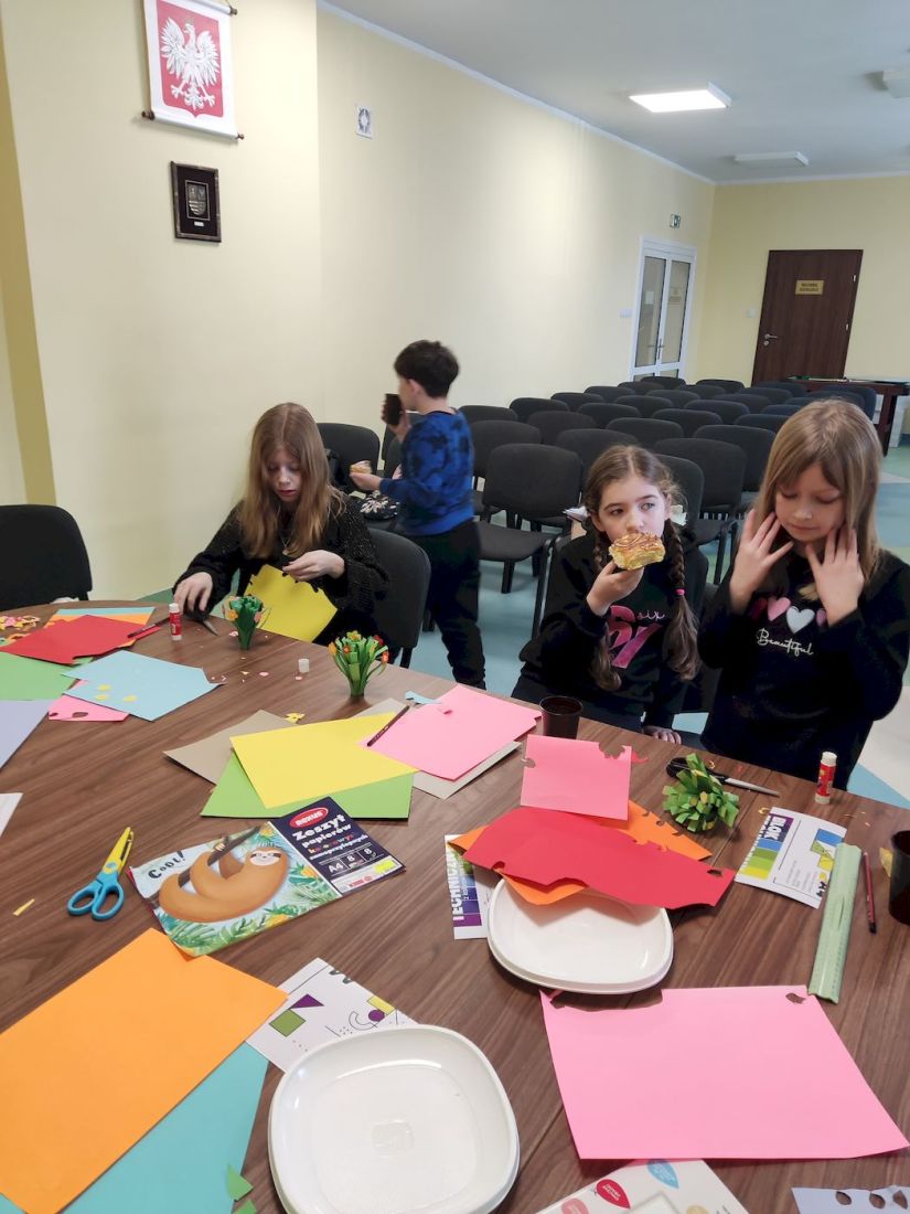 Rozpoczęły się ferie zimowe, a wraz z nimi rozpoczęliśmy w Bibliotece zajęcia dla chętnych dzieci pod hasłem „Ferie pełne przygód”. Chętnych i w tym roku do wspólnej zabawy nie zabrakło. Przeddzień święta babci i dziadka wykonywaliśmy z papieru kolorowego bukiety kwiatów. Prawdopodobnie niejedna babcia i niejeden dziadek będą mile zaskoczeni talentem plastycznym swoich wnuków. W czasie zajęć dzieci opowiadały o swoich babciach i dziadkach, o tym jak z nimi spędzają czas, za co tak bardzo ich kochają. Wszyscy zgodnie uznali, że są to dla nich bardzo ważne osoby. Nie zabrakło również ciepłej herbatki i słodkiego poczęstunku.