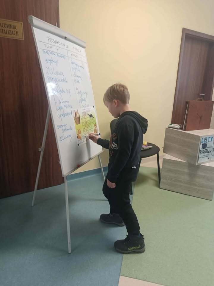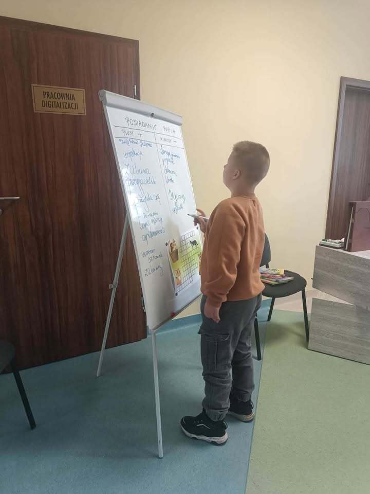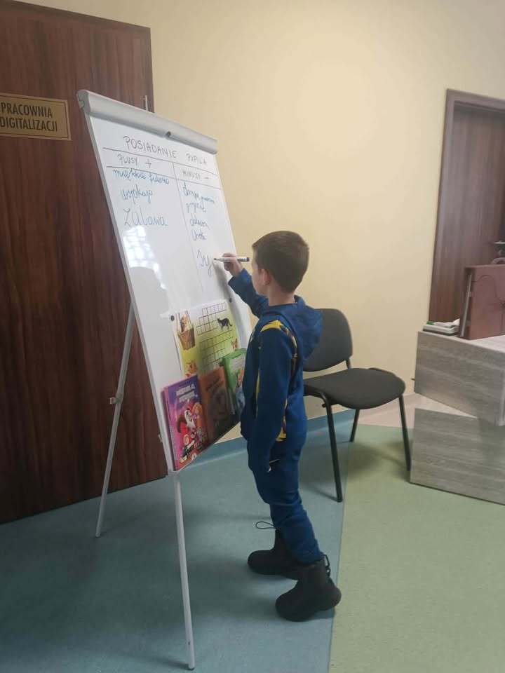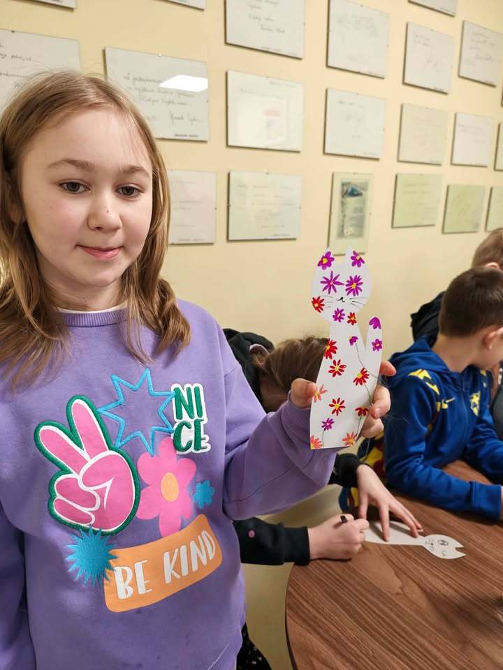 Podczas spotkania uczniowie zapoznali się z serią książek o przygodach psotnego, a jednocześnie uroczego kota Cukierka autorstwa Waldemara Cichonia. Wysłuchali i obejrzeli opowiadanie w formie Teatrzyku Kamishibai. Ta pełna humoru historia nie tylko bawiła, ale także uczyła odpowiedzialności za zwierzaki. Był to czas pełen radości, literackich wrażeń i kreatywnej zabawy. Wykonaliśmy piękne zakładki do książek w kształcie kotów, stworzyliśmy listę argumentów przemawiających za daniem kociakowi domu oraz został podpisany Pakt Przyjaźni z kotem Cukierkiem. Celem akcji była promocja czytelnictwa wśród najmłodszych oraz szerzenie pozytywnych wzorców zachowań, które pomagają budować wiarę w siebie i przyjazny stosunek do świata . Zabawny i niesforny Cukierek skradł nasze serca. Spotkanie w bibliotece upłynęło w miłej atmosferze.