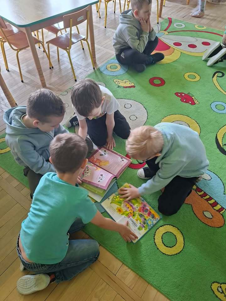 „Motylki” z zainteresowaniem oglądały przyniesione przez bibliotekarza książeczki tematycznie związane z wiosną.