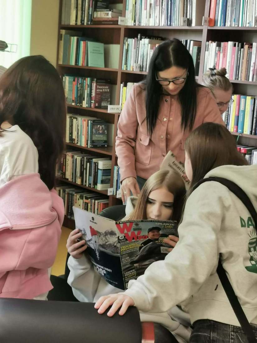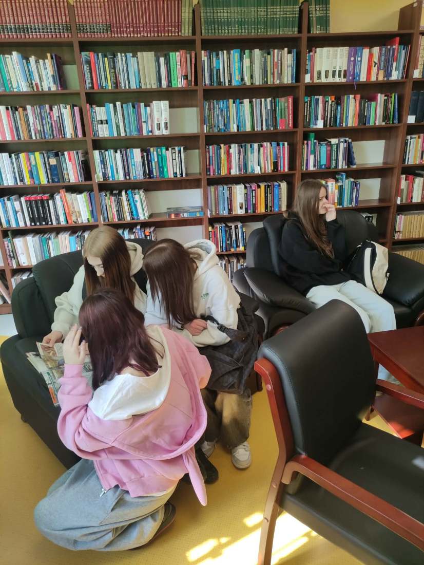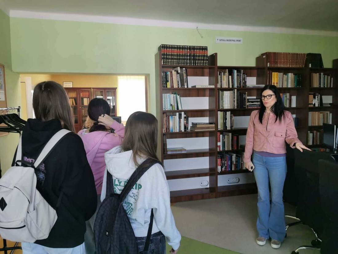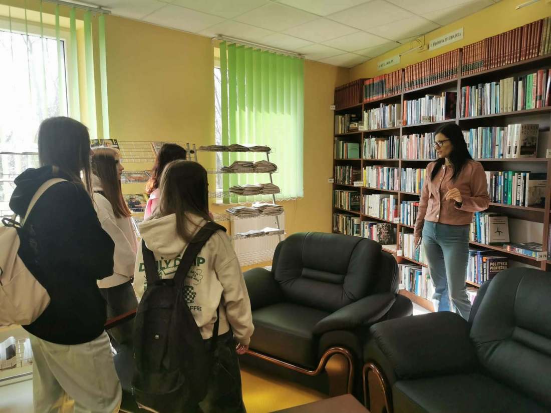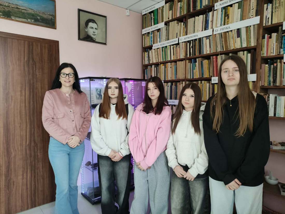 16 kwietnia 2026 r. naszą bibliotekę odwiedziły uczennice z Zespołu Szkół Samochodowo-Usługowych im. Władysława „Oseta” Wasilewskiego w Skarżysku-Kamiennej wraz z nauczycielem p. Moniką Kowalik. Wzięły one udział w lekcji bibliotecznej z zakresu edukacji regionalnej dotyczącej postaci ks. prof. Włodzimierza Sedlaka oraz miasta Skarżyska. Miały również możliwość zwiedzenia Izby Pamięci, gdzie zaprezentowano im cenne eksponaty, księgozbiór, liczne pamiątki i zbiory geologiczne. Wszystko było wzbogacone opowieściami o życiu Sedlaka i historią naszego miasta.