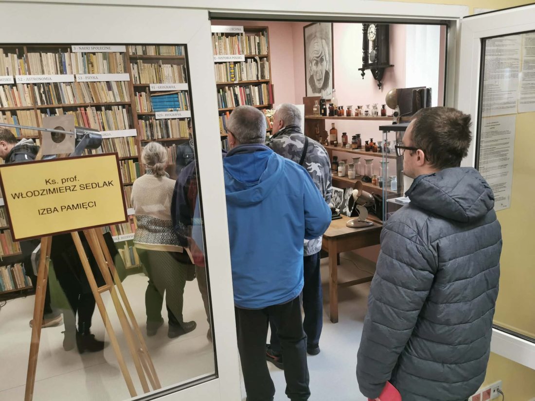 Zwiedzili Izbę Pamięci ks. prof. Włodzimierza Sedlaka, która niewątpliwie zrobiła na nich ogromne wrażenie. Uczestnicy spotkania poznali historię patrona biblioteki oraz dowiedzieli się wiele ciekawych faktów z jego życia. Z zainteresowaniem słuchali o młodzieńczych i szkolnych latach spędzonych w Skarżysku oraz o pracach badawczych, jakie prowadził w Górach Świętokrzyskich. Mieli możliwość obejrzenia znalezisk geologicznychŁysogór, które umieszczone są w specjalnych gablotach. Zaprezentowane zostały również rzeczy użytku codziennego, które pochodzą z radomskiego mieszkania Sedlaka np. maszyna do pisania, magnetofon i telefon z cyferblatem.