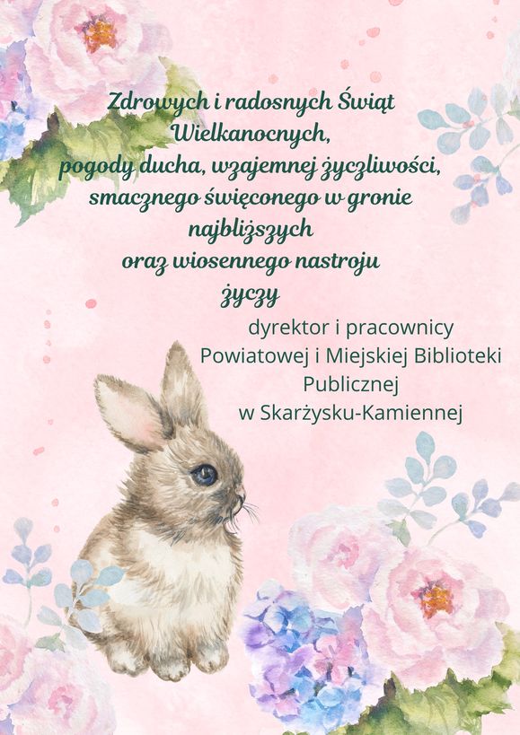 Życzenia Wielkanocne Post published:1 kwietnia 2026 Post category:Dla dorosłych / Komunikaty Zdrowych i radosnych Świąt Wielkanocnych, pogody ducha, wzajemnej życzliwości, smacznego święconego w gronie najbliższych oraz wiosennego nastroju życzy dyrektor i pracownicy Powiatowej i Miejskiej Biblioteki Publicznej w Skarżysku – Kamiennej Read more articles Previous PostBiblioteka – niezwykłe miejsce